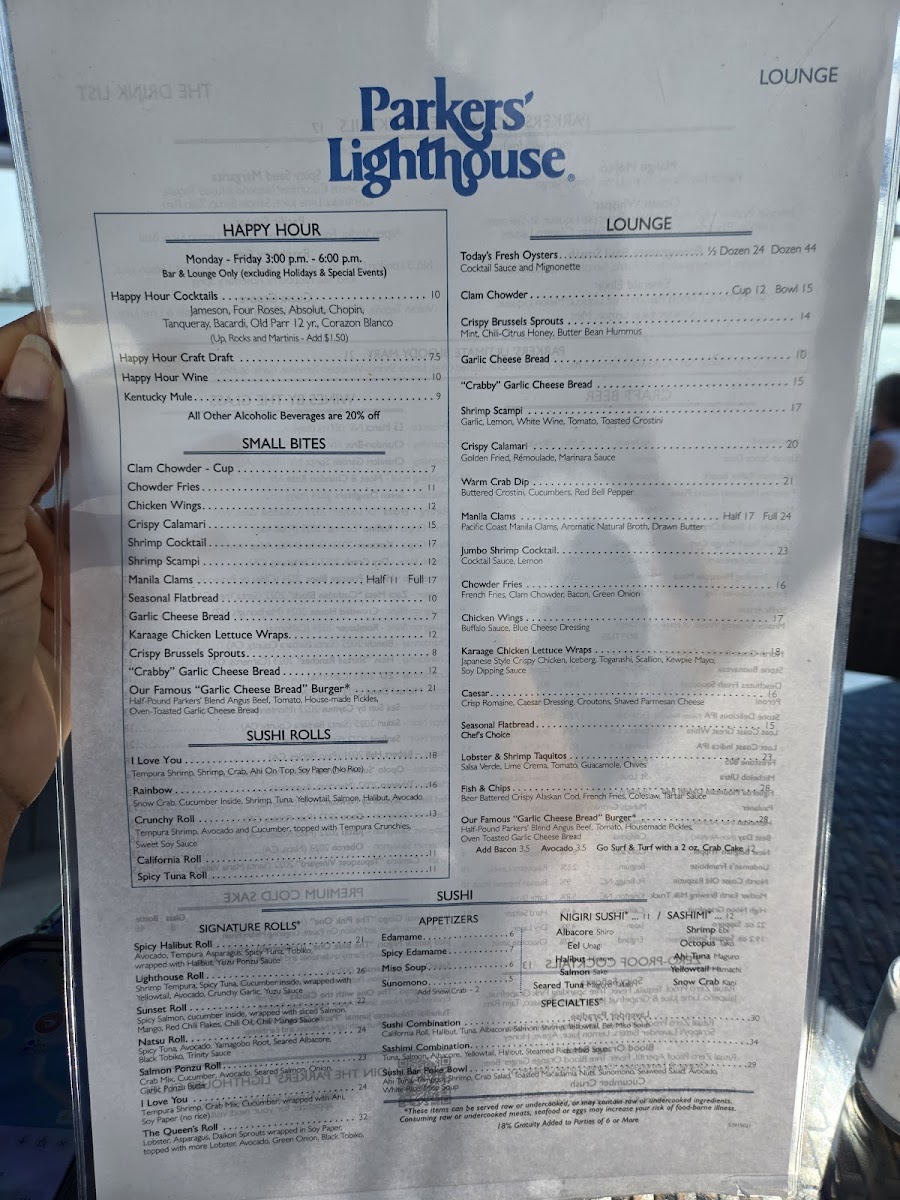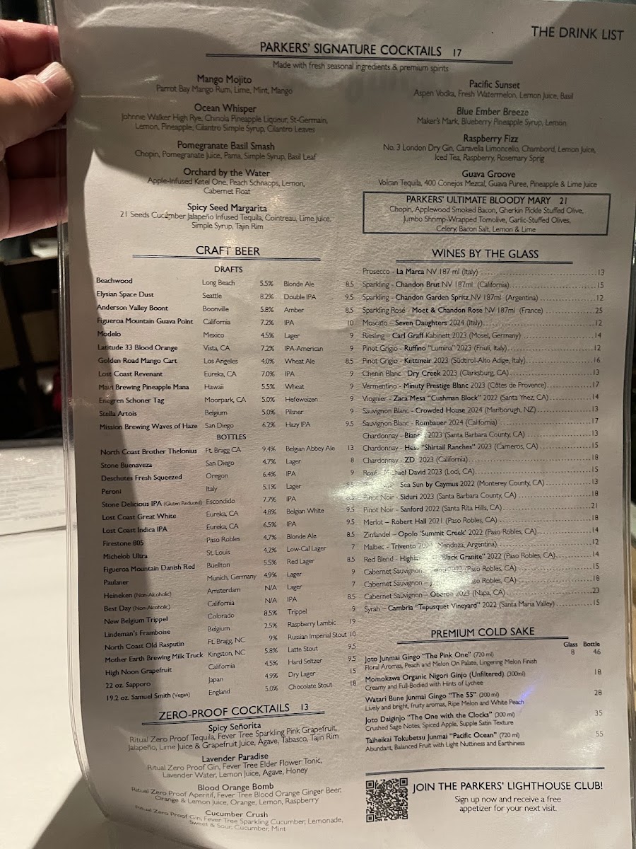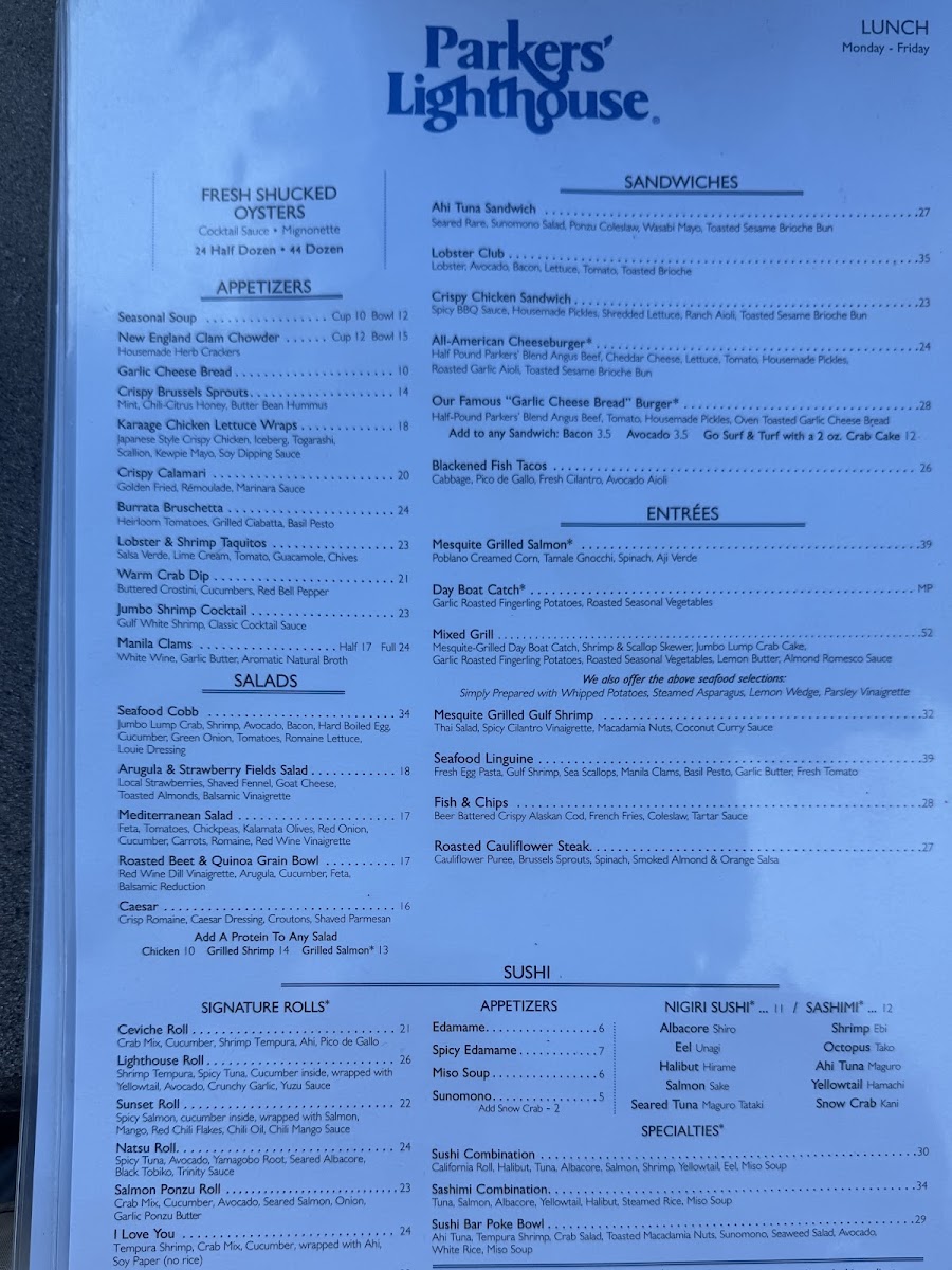 The menu at Parkers' Lighthouse offers a diverse selection of seafood-centric dishes alongside a variety of steak and poultry entrees, complemented by an array of appetizers, desserts, and specialty rolls. The menu is structured to provide options suitable for casual dining occasions including lunch, dinner, and drinks.