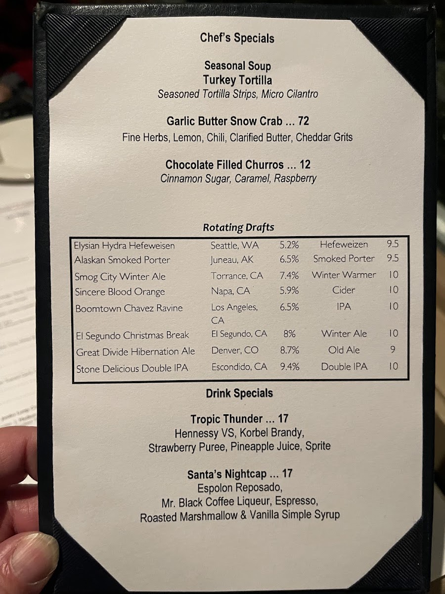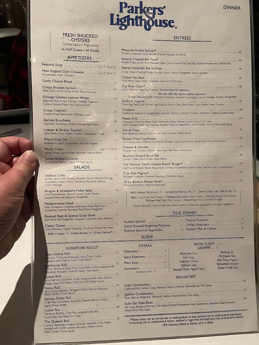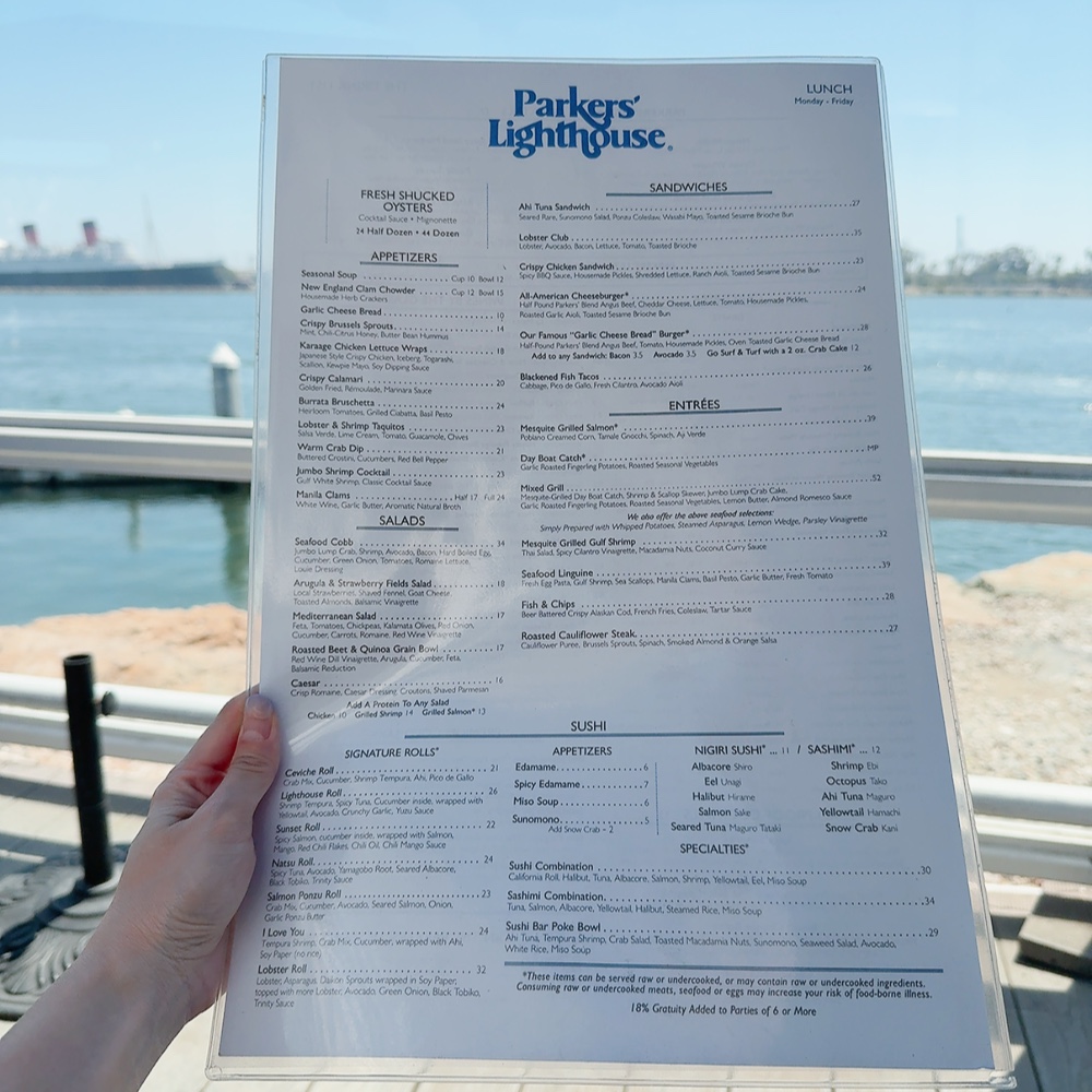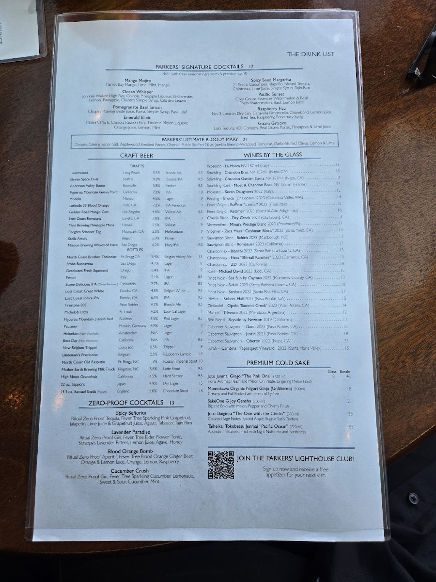 The menu at Parkers' Lighthouse offers a diverse selection of seafood-centric dishes alongside a variety of steak and poultry entrees, complemented by an array of appetizers, desserts, and specialty rolls. The menu is structured to provide options suitable for casual dining occasions including lunch, dinner, and drinks.